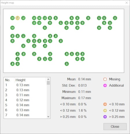 - Höhenprüfung der einzelnen Braille-Punkte – jeder einzelne Braille-Punkt wird mit den Höhentoleranzen verglichen und Abweichungen werden angezeigt
